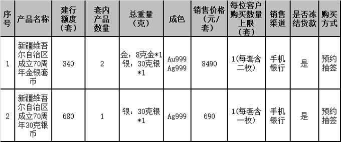 1.应有关要求,本次贵金属纪念币面向实名客户销售,新疆维吾尔自治区成立70周年金银纪念币采用“预约抽签”方式确定可购买的客户。本产品对应的每位客户购买数量上限等请见本公告第一条中“具体产品信息”内容。